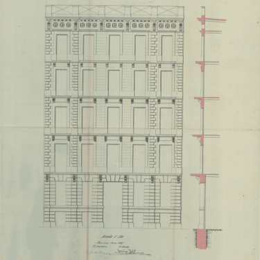 El Plano de Fachada (Alzado): Muestra una estructura sobria y proporcionada de cinco niveles (planta baja y cuatro pisos). Destaca la jerarquía clásica: un gran Piso Principal con balcón corrido para la residencia más noble, y tres pisos superiores con balcones individuales.