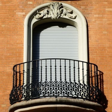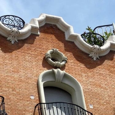 El toque modernista: Los balcones presentan una losa ligeramente ondulada, rompiendo la rigidez de las líneas rectas. Las barandillas de forja, trabajadas con delicadeza, son un ejemplo clásico de las artes aplicadas del momento.