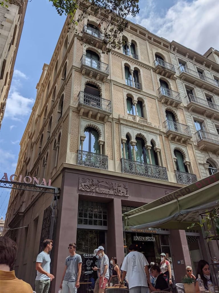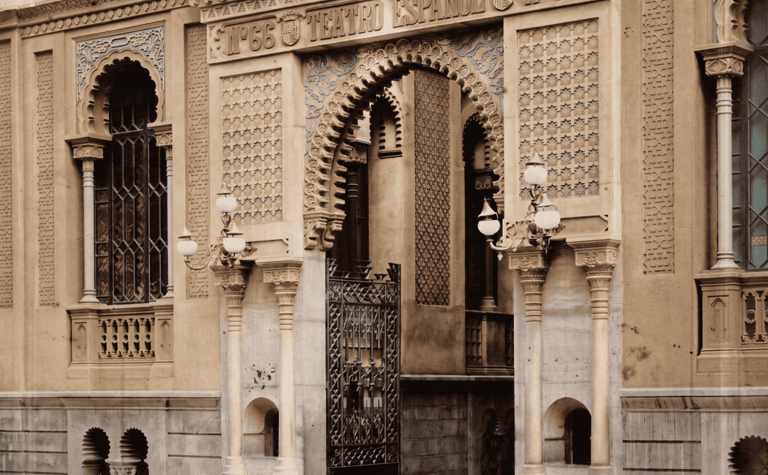 Balet diseñó esta imponente entrada para conectar la calle principal con el teatro, escondido en el interior de la manzana. En la fachada del pasaje, a cada lado de la puerta principal que lucía el rótulo del teatro esculpido, Balet integró dos pequeñas ventanas que hacían la función de taquillas para la venta de entradas. Tras un incendio en 1889, el local del Teatro Español tuvo muchas vidas: fue reconstruido como el Jardín Español, más tarde funcionó como fábrica de curtidos, luego como garaje y concesionario, y hoy alberga el conocido restaurante El Nacional.