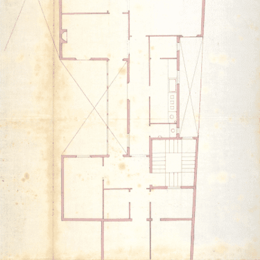 Al observar el plano de planta original delineado por Balet y compararlo con la vista aérea actual (delimitada en rojo), descubrimos el inmenso reto arquitectónico al que se enfrentó. El solar tiene una caprichosa forma de "zig-zag" o tetris, adentrándose profundamente en el interior de la manzana. Para garantizar la habitabilidad, luz y ventilación de todas las viviendas, Balet tuvo que encajar la escalera y varios patios de luces interiores como si de un complejo rompecabezas se tratara.
