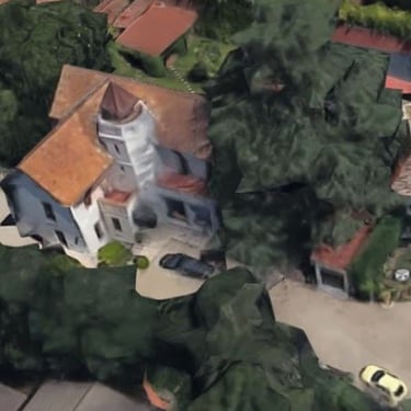 La Torre Central: En el punto de unión de estas alas se alza una torre poligonal, rematada por un característico tejado también poligonal y terminado en punta (coronado por un pararrayos/veleta), que le otorga un inconfundible aire de château rural.