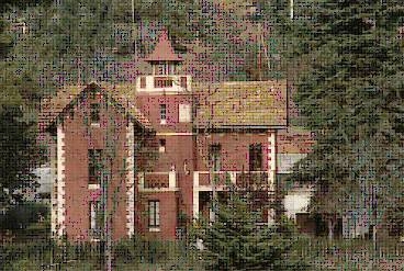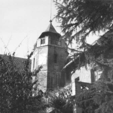 Elementos arquitectónicos distintivos: Estilo historicista de inspiración alpina, planta en ángulo recto, torre central poligonal, tejados a dos aguas de gran pendiente con aleros de madera, terraza cubierta con celosía.