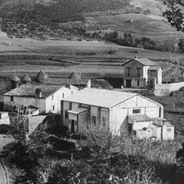 La imagen aérea histórica nos revela el edificio en su contexto rural original, rodeado de campos cultivados y masías: