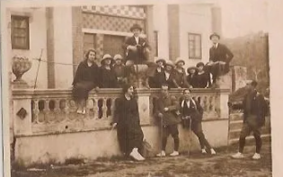 Archivo fotográfico histórico: Vista exterior de la nave y retrato social en la terraza con balaustrada.