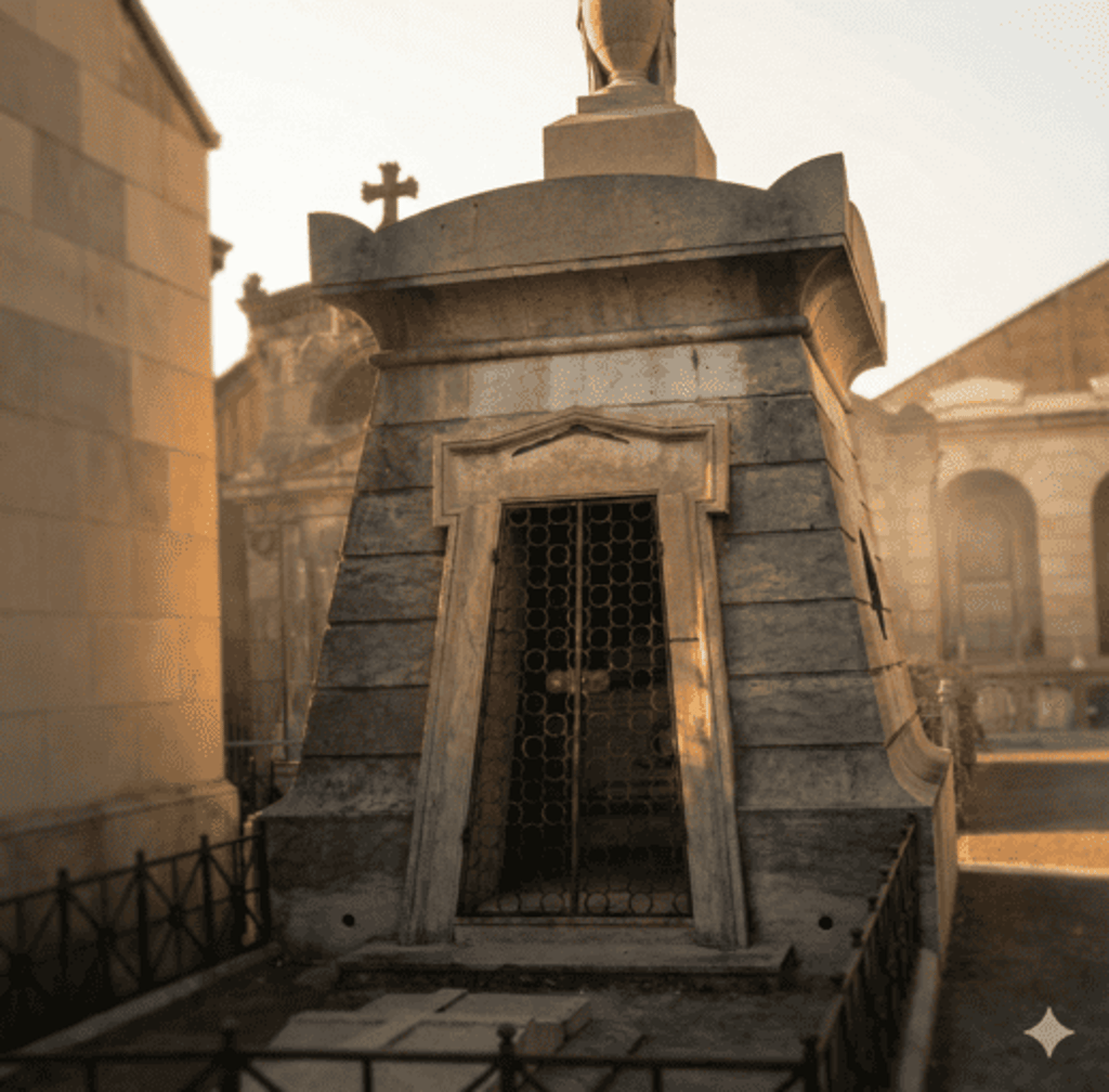 Influencia Neoegipcia: La estructura troncocónica recuerda a las antiguas mastabas egipcias, una referencia arquitectónica muy popular en el ámbito funerario de la época, que conectaba con la eternidad de los faraones.